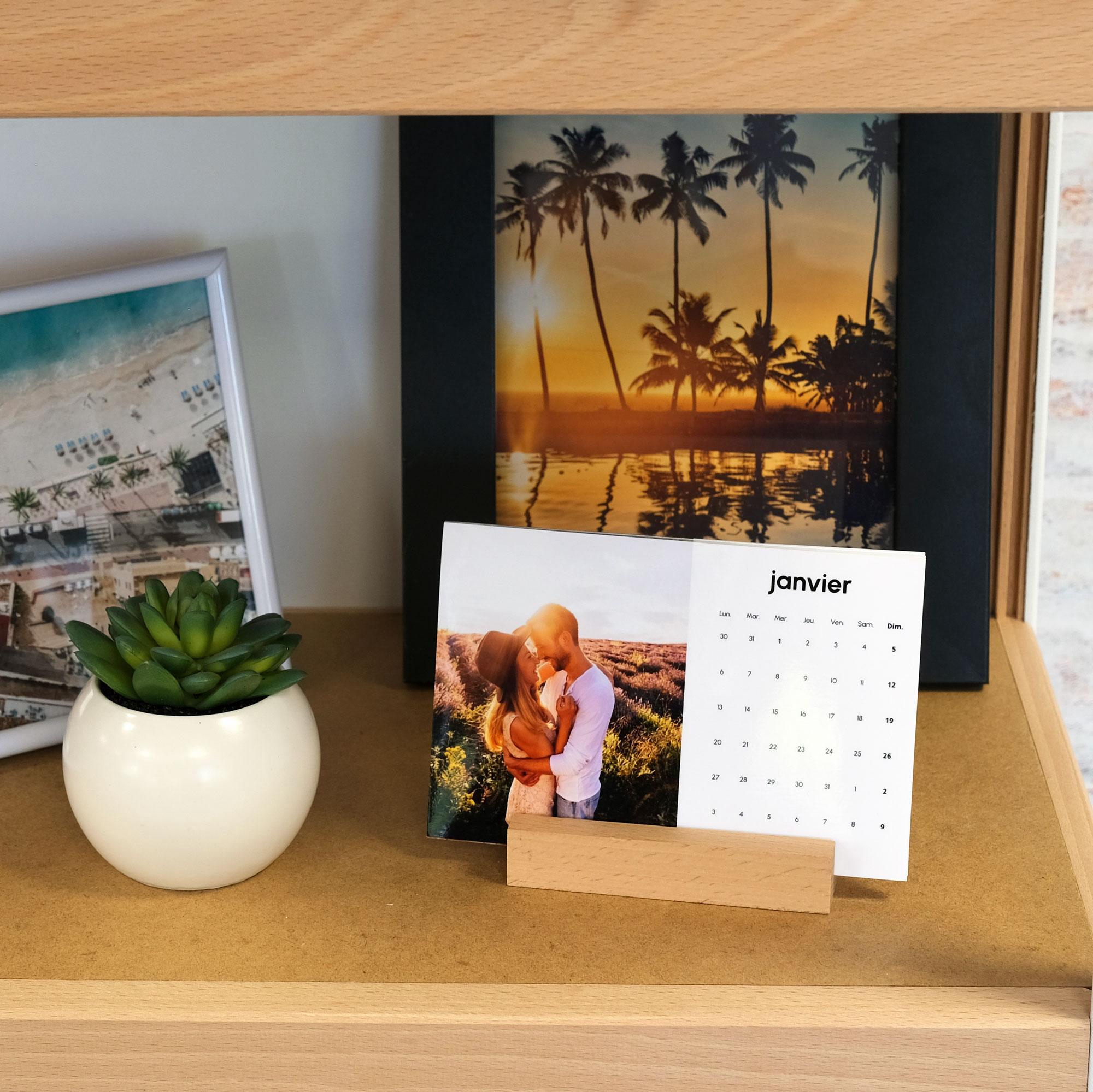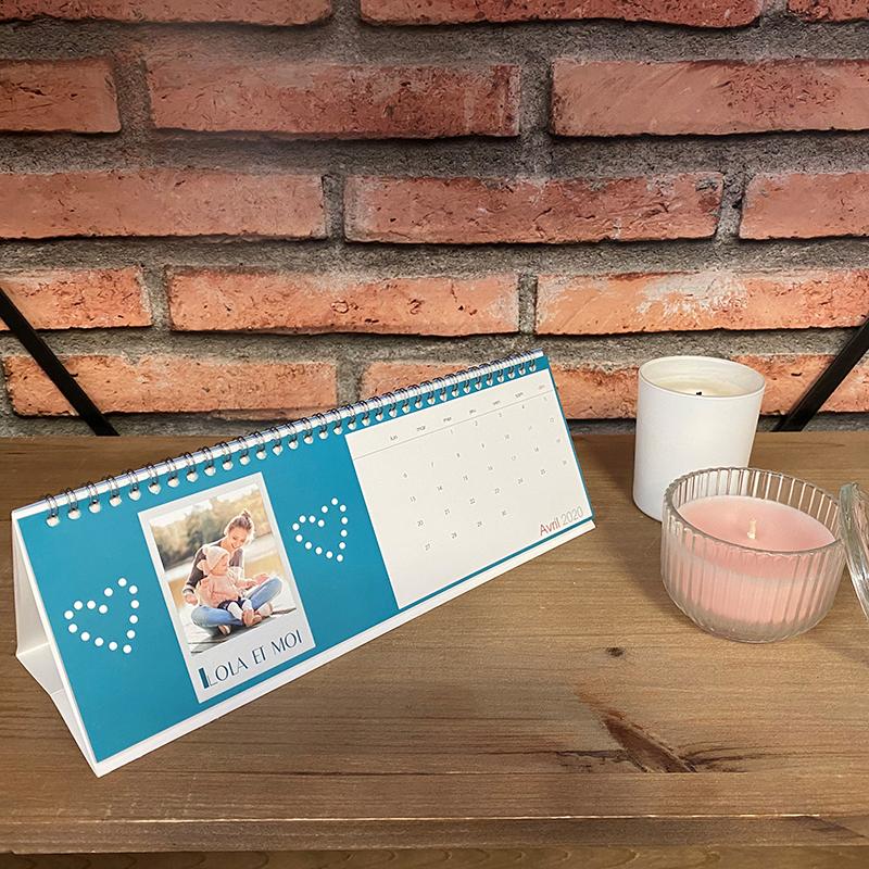 - Le calendrier de bureau : Ce calendrier personnalisé 30x10cm sur chevalet en carton pour pouvoir le poser, présente pour chaque mois de l’année, une photo sur le côté gauche et la grille de calendrier sur la droite.